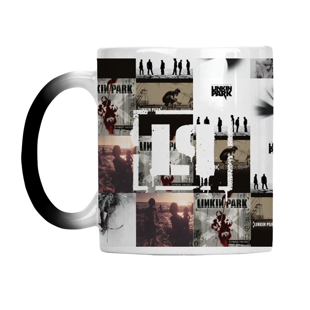 Matte black ceramic mug featuring white LP logo. Matte black fades away to reveal album covers when filled with hot liquid. Top-rack dishwasher and microwave safe. 11 oz.