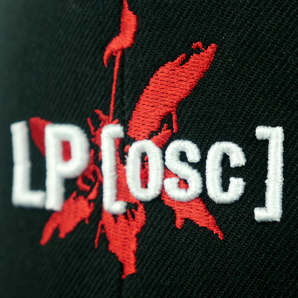 Black snapback hat featuring a double-layered embroidery on the front: "LP [OSC]" is 3D puff-embroidered on top of a flat-embroidered street soldier.